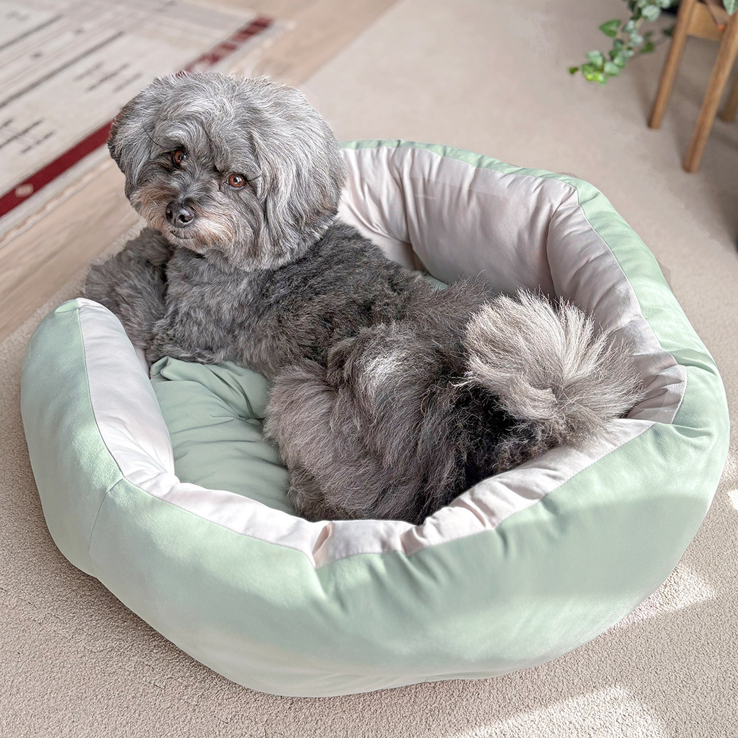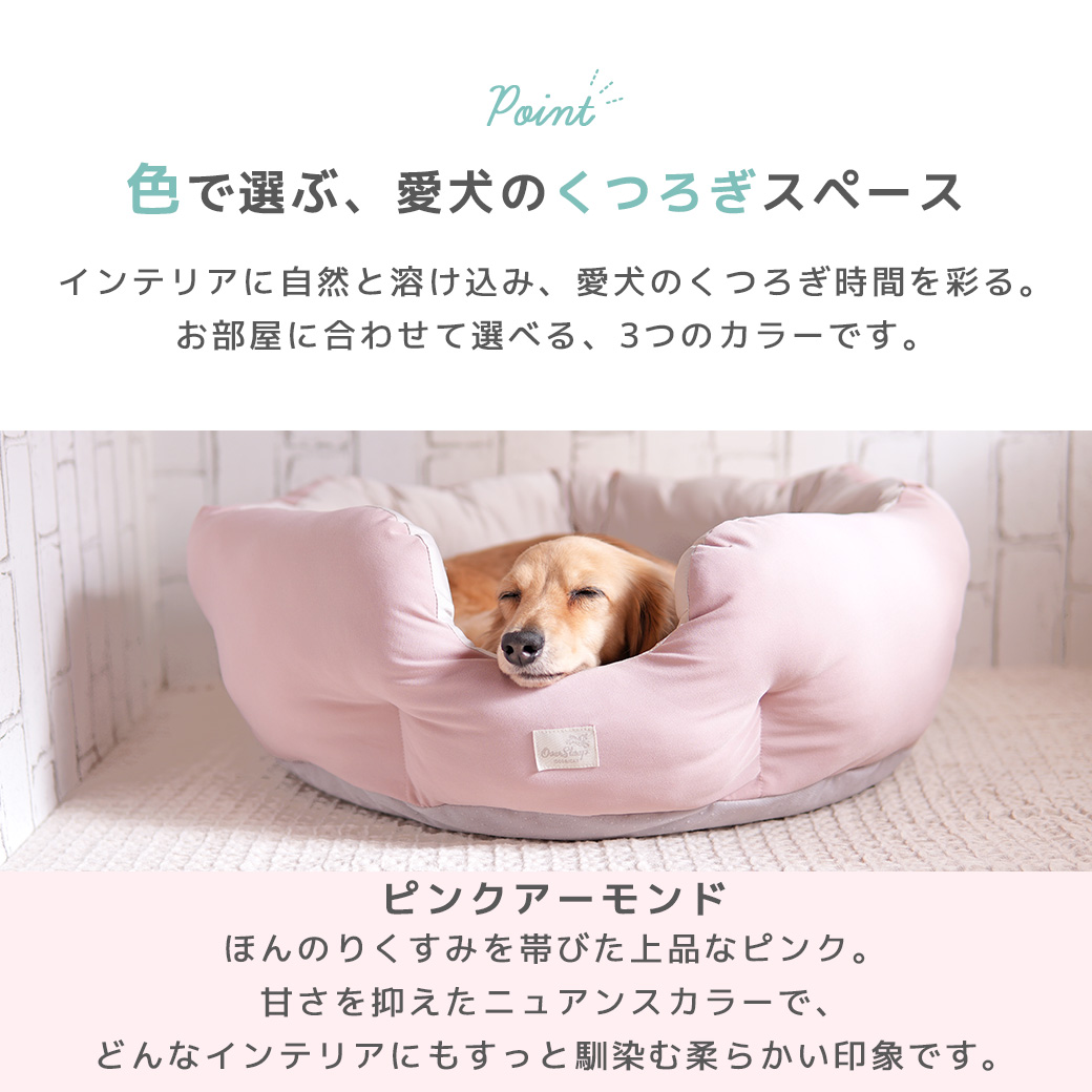 壁面にすっぽり包まれるラウンド型ペットベッド。