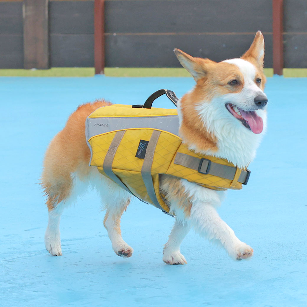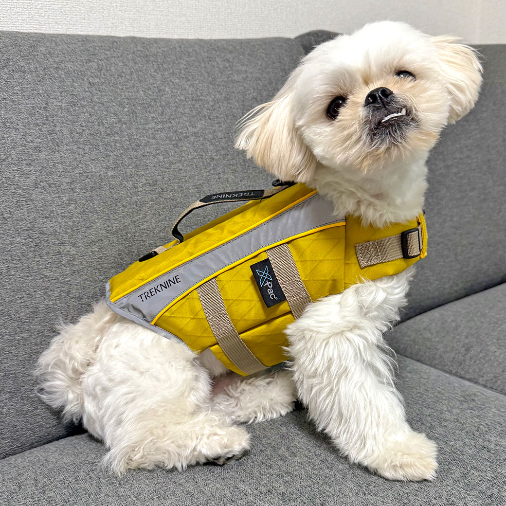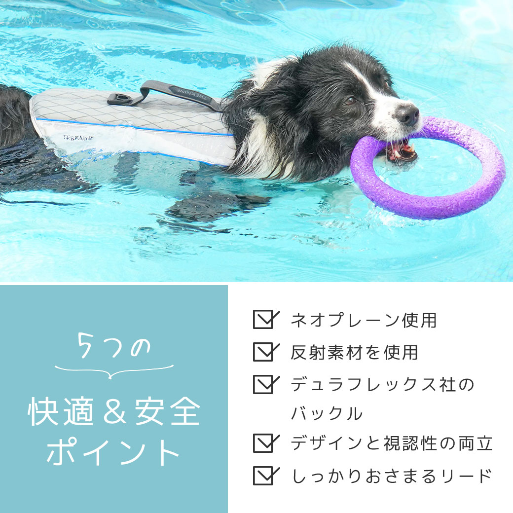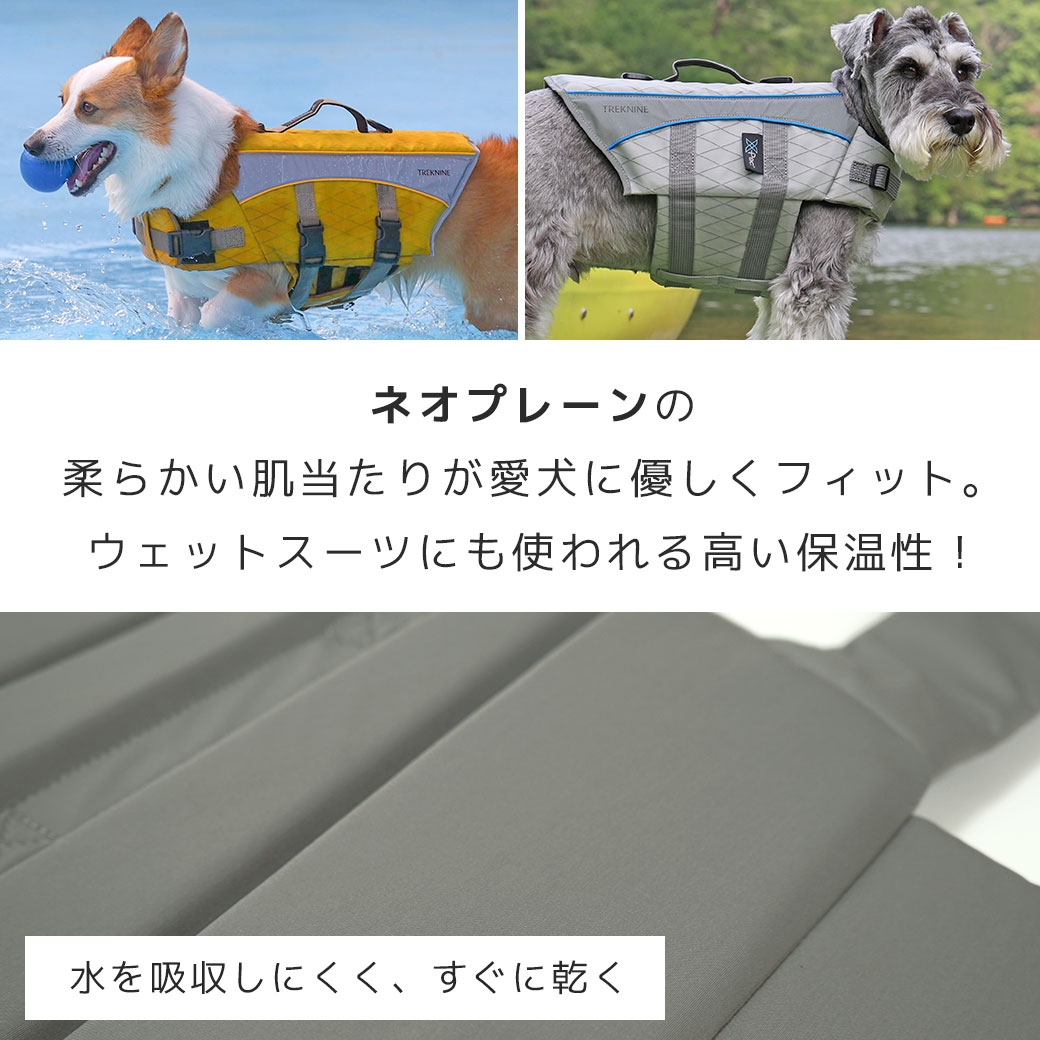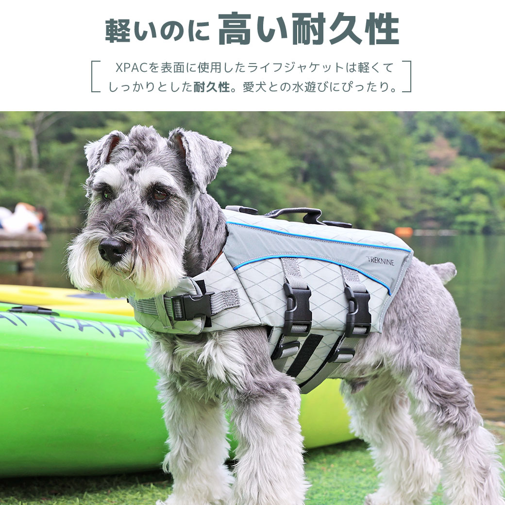 耐久性の高いXPAC素材をつかった愛犬用のライフジャケットです。反射機能や背中の持ち手など細部にこだわって仕上げたフローティングベストです。 背中部分を4分割して高いフィット性を実現させました。 また、最大の特徴は、浮力板の厚みを場所によって変更し、より愛犬が泳ぎやすく安定する設計にしたことです。 TREKNINEのフローティングベストで夏を思いきり楽しんで。