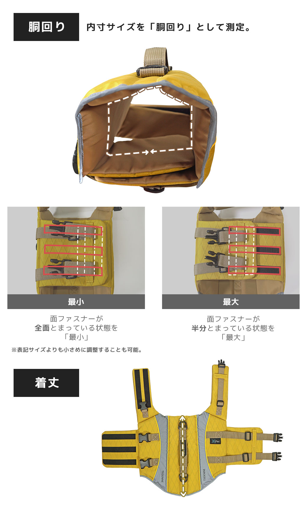 ※首(胸)周りと胴回りは面ファスナーと調整紐で調整可能です。