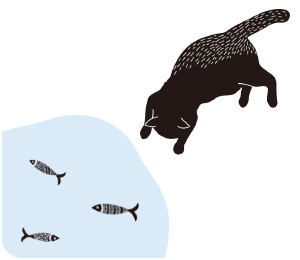ふちには魚を狙って下を覗き込んでいる黒猫が1匹。 お皿の底には水たまりの中を泳ぐ魚たちのイラスト入りです。 魚のイラストで書かれた「ICAT」の文字が遊び心のあるデザイン。 フードを入れた状態だと、黒猫がフードを狙っているようで可愛いですよ。