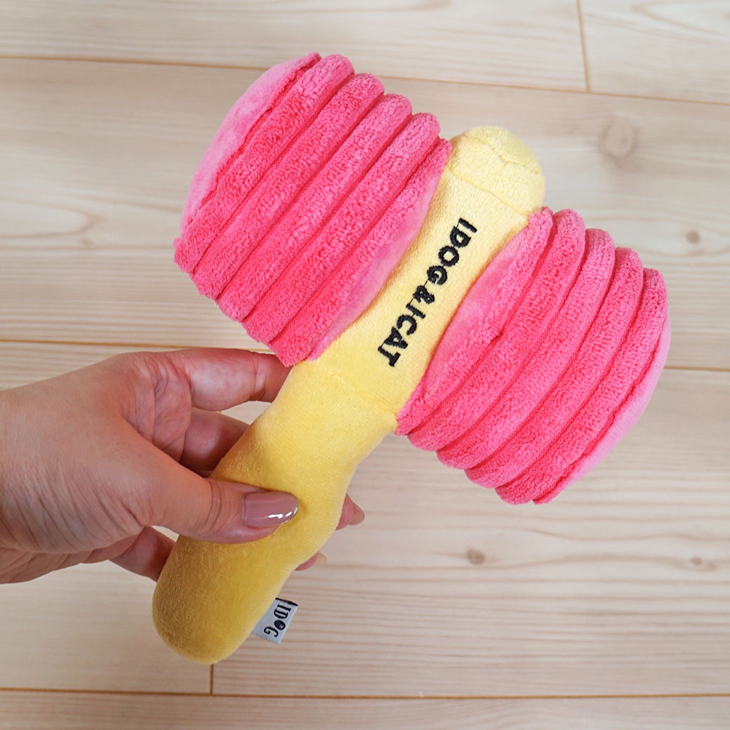 ピコピコハンマー型のユニークな布製おもちゃ。 カシャカシャと鳴き笛入りでテンションUP。