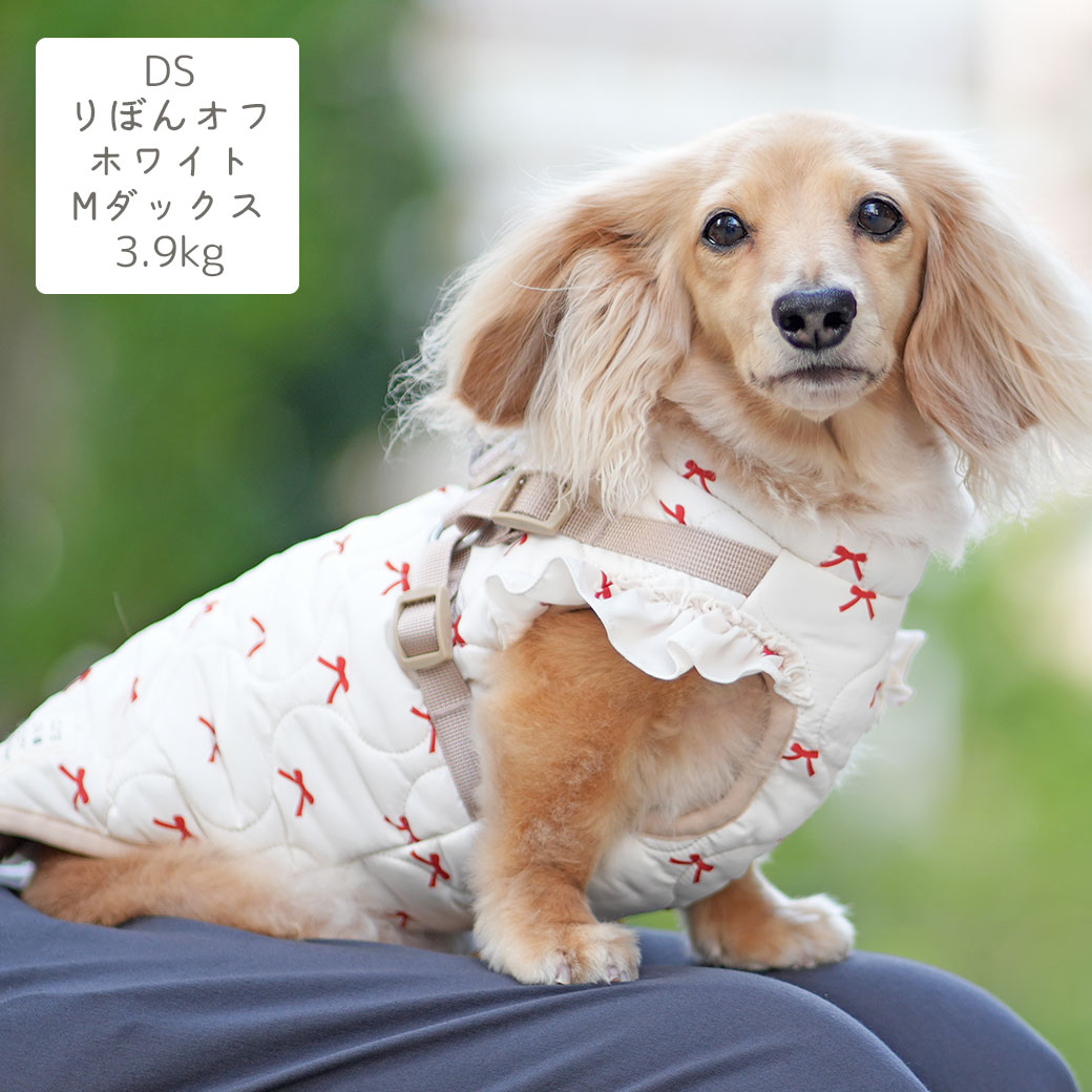 ミニチュアダックス3.9kg(首25/胴37/丈31cm)のクムちゃんはりぼんオフホワイトのDSを着用