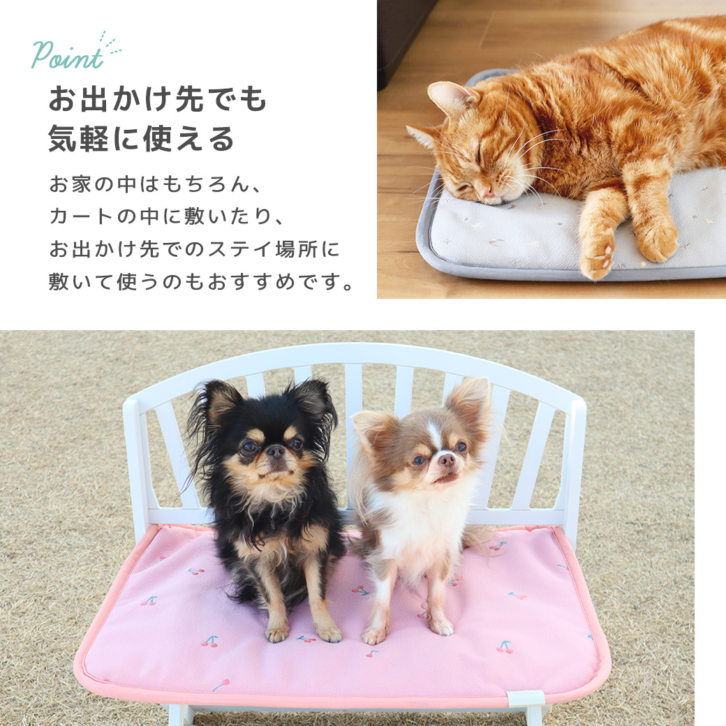 お家の中はもちろん、カートの中に敷いたり、お出かけ先でのステイ場所に敷いて使うのもおすすめです。
