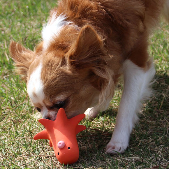 小さな子が噛みやすいように柔らかめに仕上げました。 噛むとキューキューと音が鳴り、一人遊びはもちろんトレーニングなどにもピッタリな小型犬向きのおもちゃです。