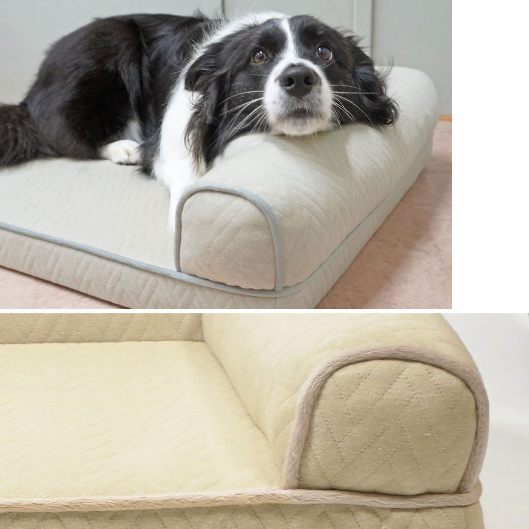 先代犬が晩年のとき急激に足腰が弱くなってしまっていつも使っていた縁が高いベッドだと入るときに躓いてしまったり、中でうまく立ち上がれなかったりして急いでマットタイプの物を用意したんですが、このタイプのベッドだと出入りしやすくていいですね。 ラムネもお気に入りで縁に顔をのせて寝ていたりしています♪