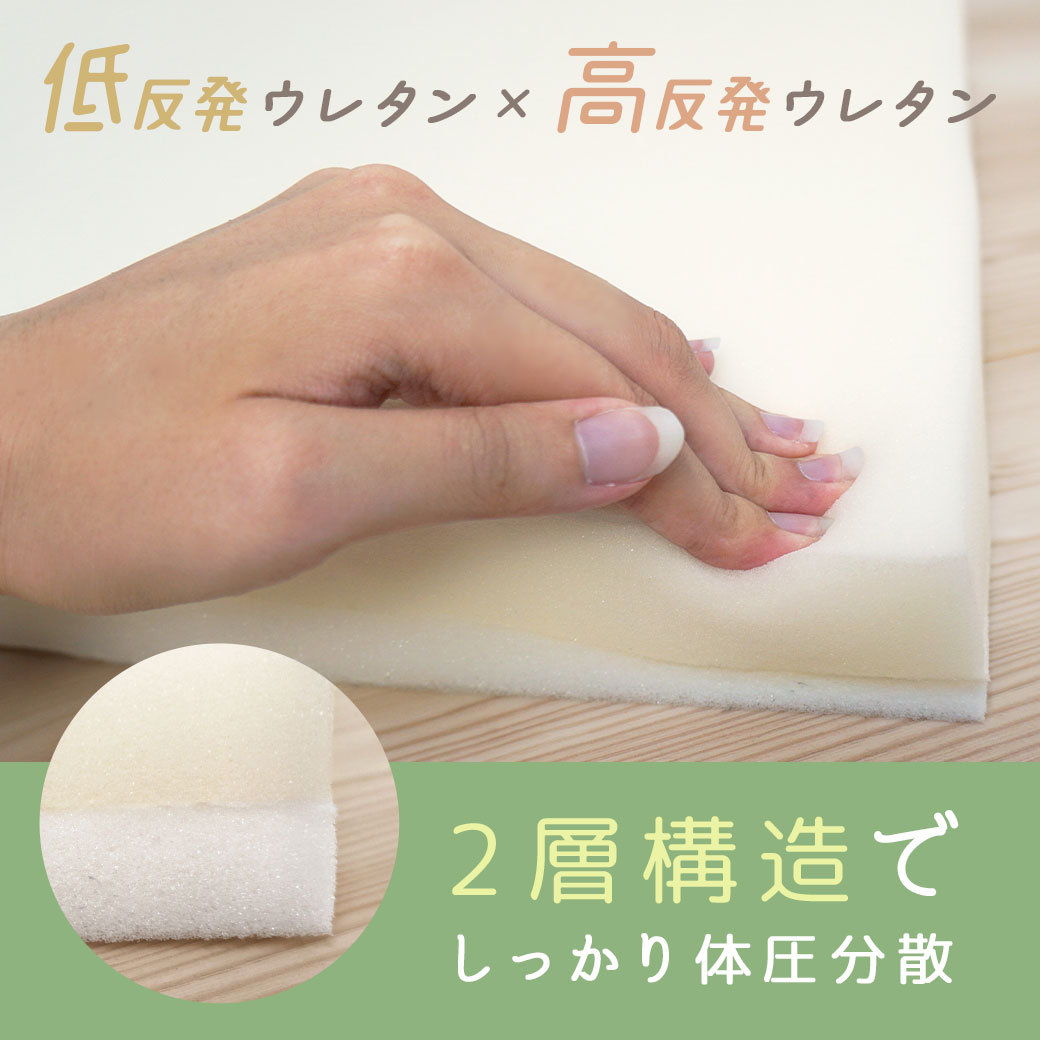 上の低反発素材のウレタンはシニアペットの身体を優しくサポート。下の高反発素材はベッドから立ち上がるときに足の沈み込みを防ぎます。