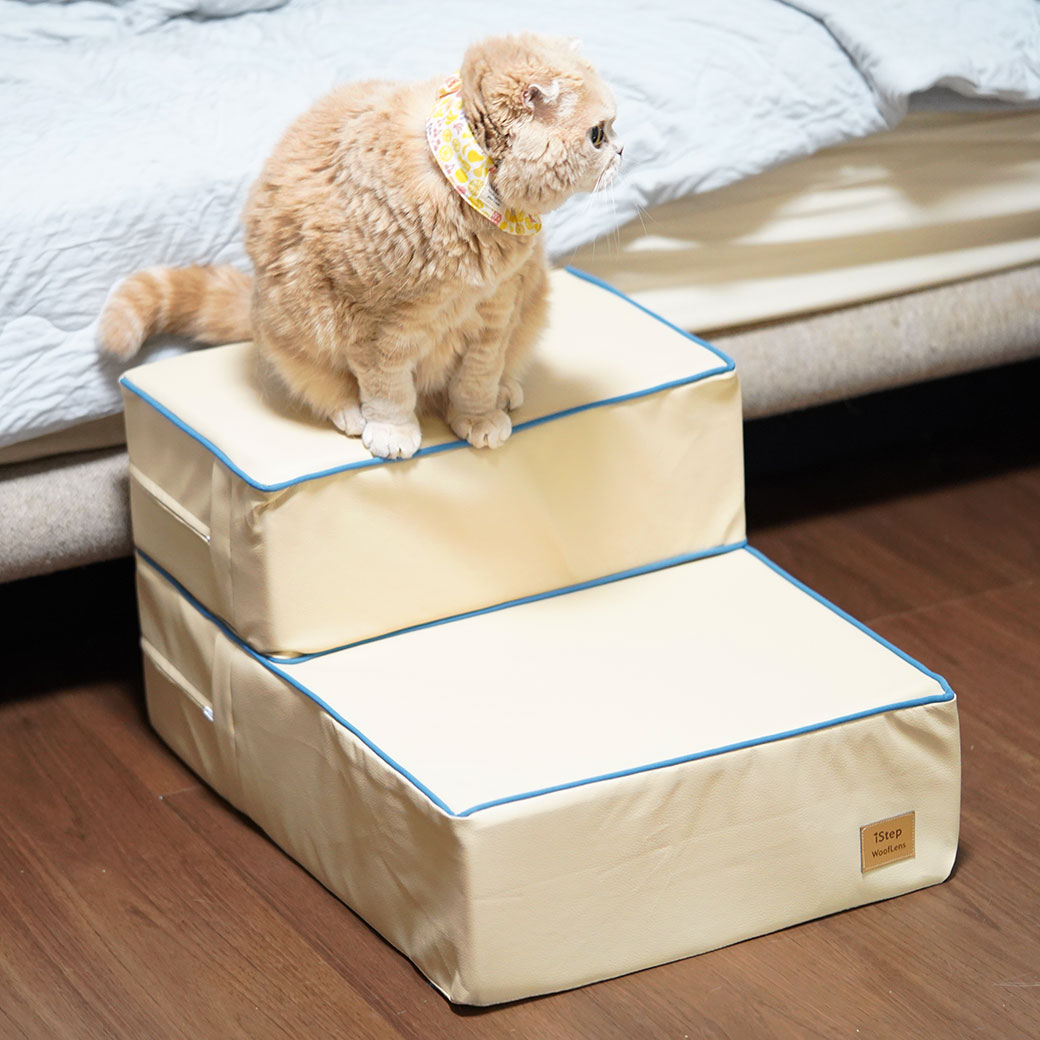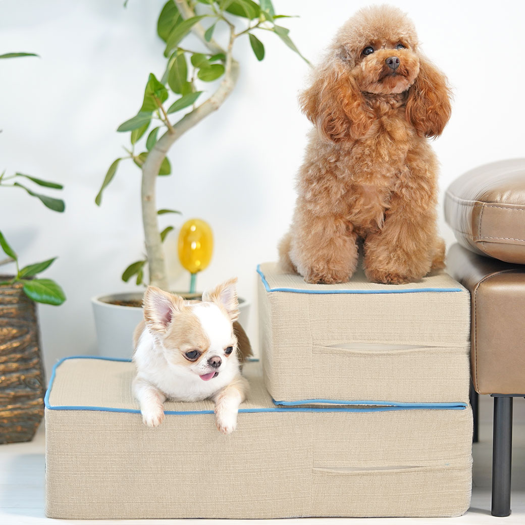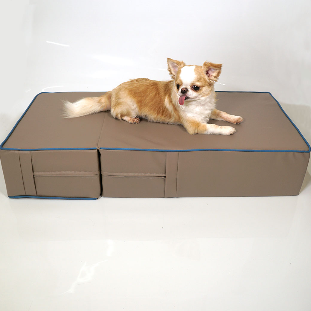 2段の階段状の形をしたソファ、フラットな長方形のソファと2タイプの使い方ができる愛犬・愛猫用のステップです。 上部をたたむことで階段状になります。ベッドや人間用ソファへの昇り降りがスムーズになり、関節の弱い愛犬の生活がより快適になるようサポートします。