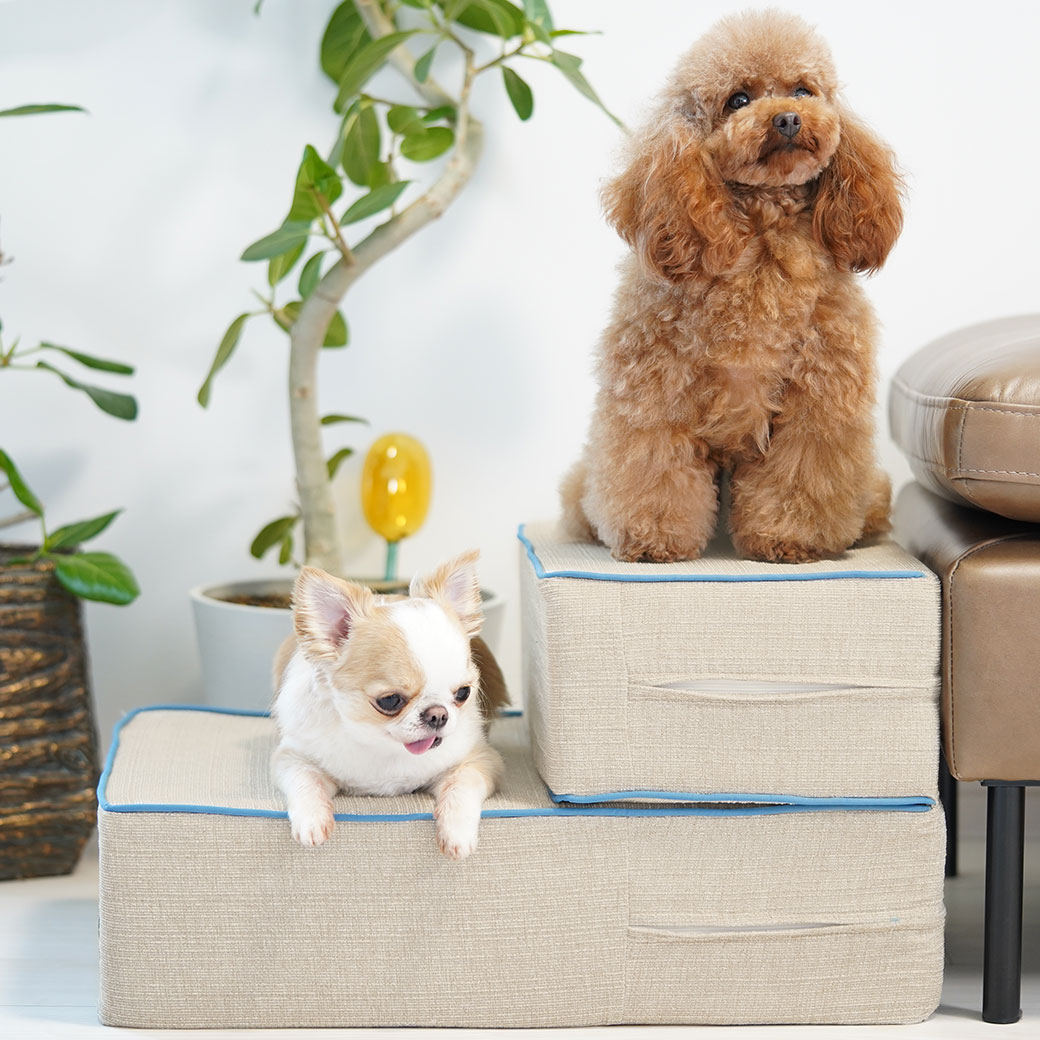 シニア期のペットや身体が形成されている途中のパピーはもちろん、足腰の弱いわんちゃん、足の短い犬種にもおすすめしたい優しい設計のペット用昇降ステップです。