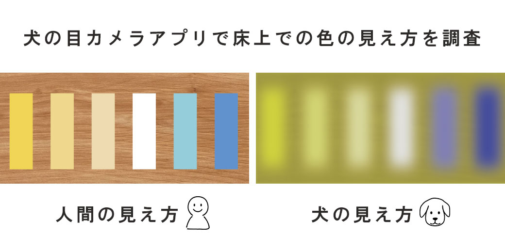 図は一般的な床材の上に様々な色を配置し、犬の視界ではどのように映っているのかを専用のカメラアプリを用いて調査したものです。