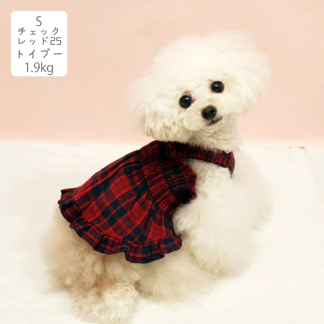 トイプー1.9kg(首17/胴29/丈22cm)のメリナちゃんはチェックレッド25のSを着用