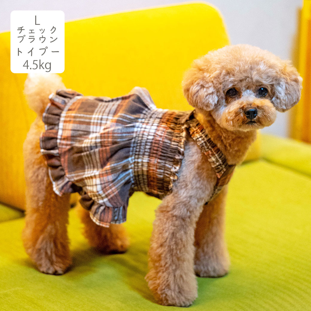 トイプードル4.5kg(首26/胴40.5/丈30cm)の里梨衣ちゃんはチェックブラウンのLを着用