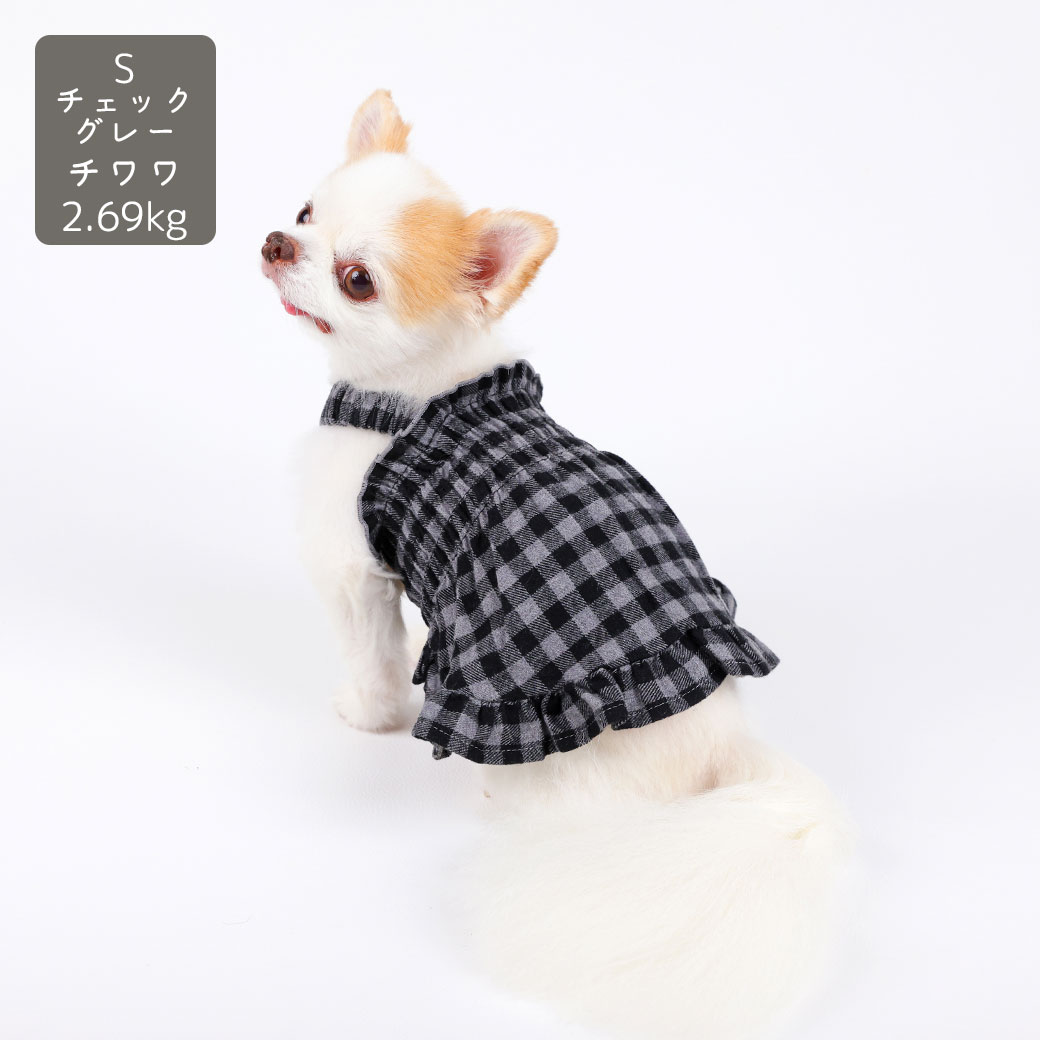 チワワ2.69kg(首21/胴34/丈25cm)の涼央くんはチェックグレーのSを着用