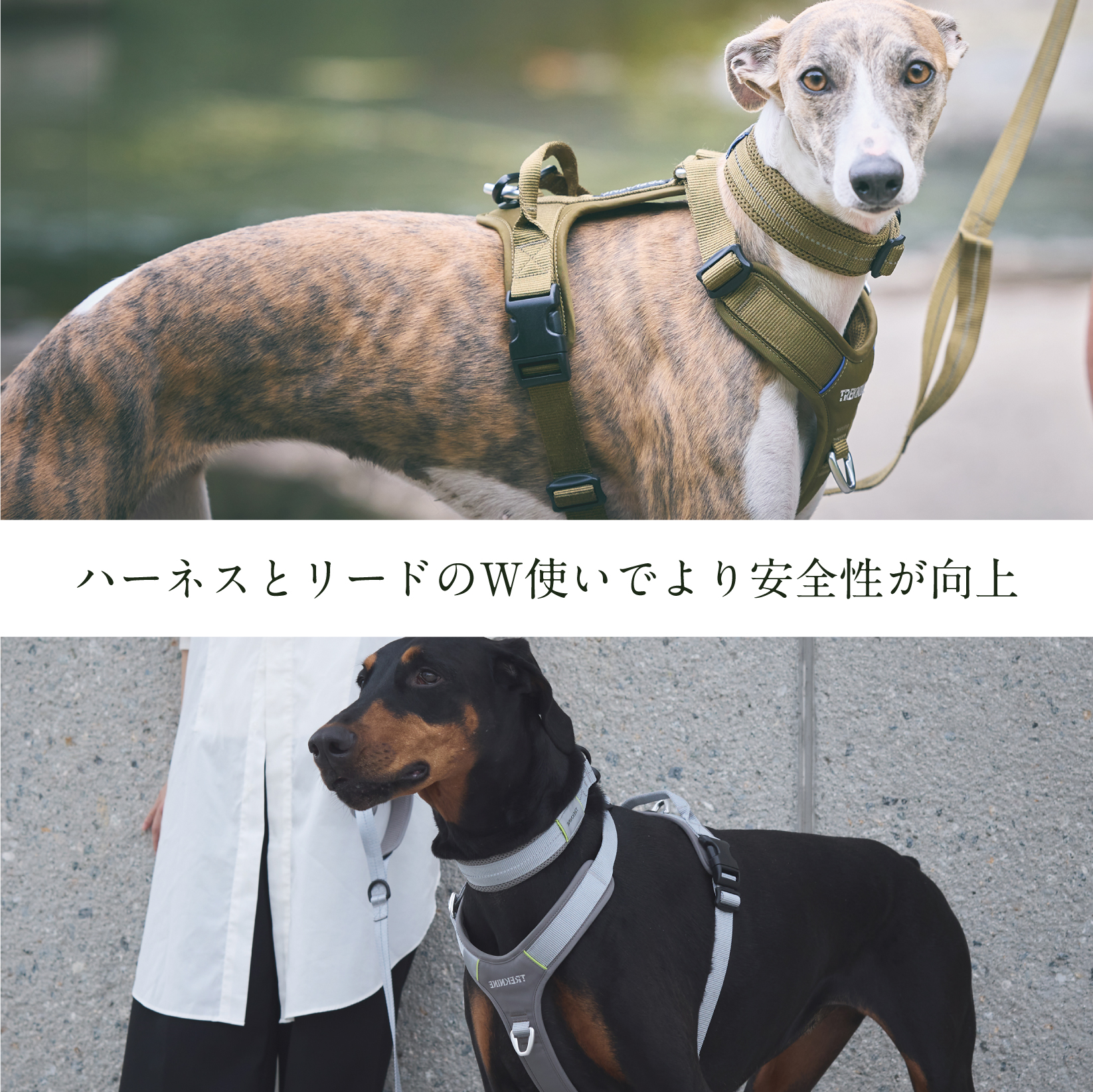万が一を少しでも減らすため、特に引っ張りの強い子やアクティブな子は ハーネスとWで装着する方法がおススメです。万が一どちらかが抜けたり故障してしまった場合も安全に対処できます。