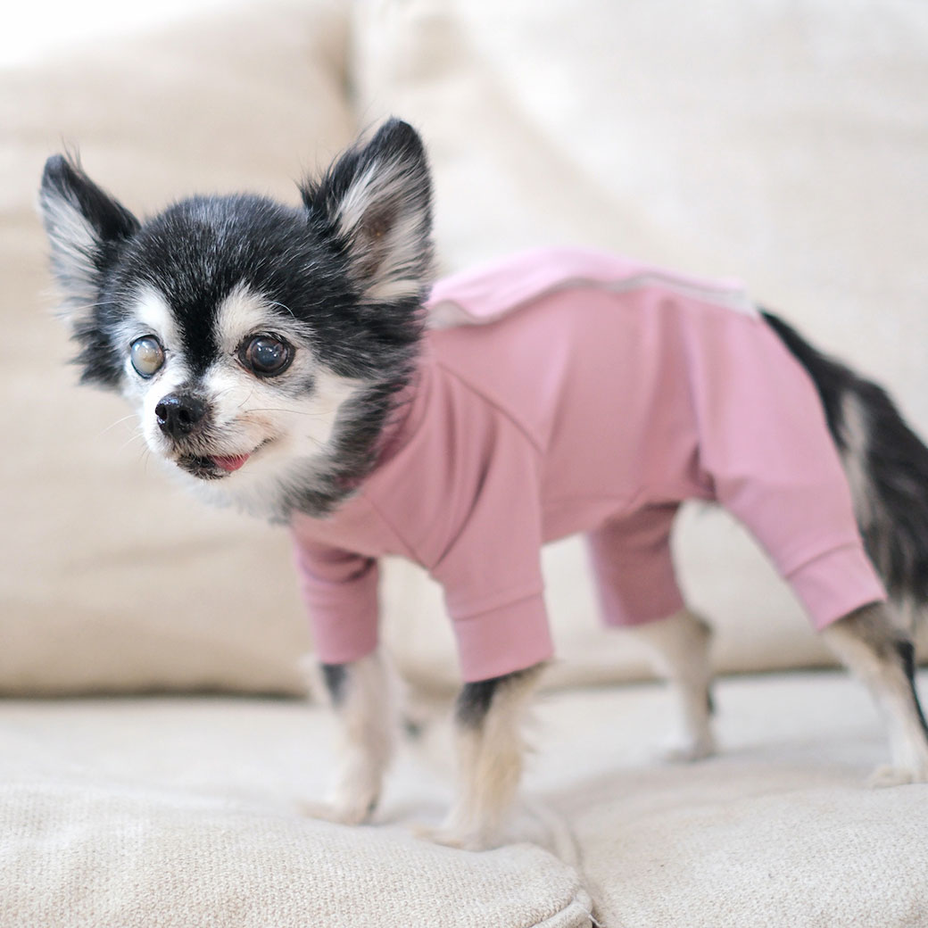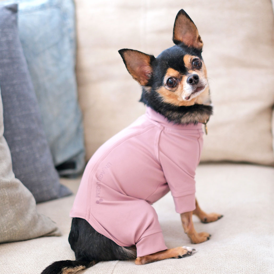 チワワ2.4kg(首22/胴33/丈27cm)のコナちゃんはアッシュピンクのSを着用