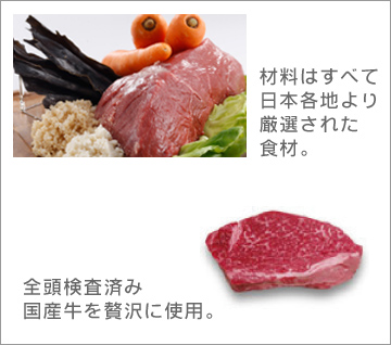 「ドットわんごはん」は牛肉を実に26%使用。安心してワンコが摂取できるよう、新鮮で上質な食品用の国産牛肉を安定調達できる環境を整えました。原料となる国産牛肉は全頭検査により安全を管理しています。また牛骨はOIE(国際獣疫事務局)の厳しい基準による加熱処理を行い減菌しています。食材の持ち味を活かすため、調理法にもこだわりが。手間をかけて調理することで素材の味と薫りを活かしています。