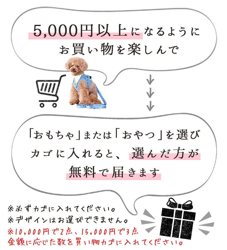 5000円以上のご購入でおやつorおもちゃをプレゼント。デザインやカラー、種類や味などはおまかせください。